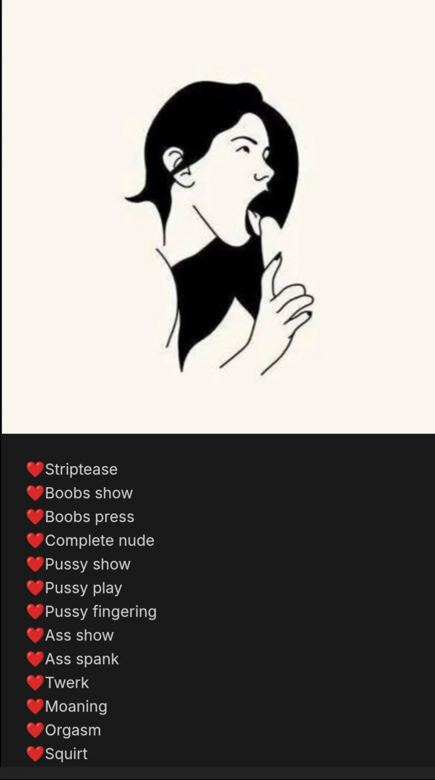 烹饪, 下流話, 狗式, 骑脸, 高跟鞋, 按摩, 乳头玩具, 性玩具, 肛交, 后庭玩具, 色情舞, 颜射, 指交, 洗澡, 赤裸上身, 高潮脸, 口交, 骑乘女, 假阳具或震动器, 快闪裸体, 精油表演, 舔鲍鱼, 情境扮演, 潮吹, 脱衣舞